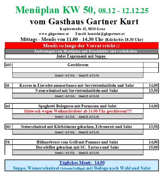 Mittags-Menüplan KW 50, 08.12.-12.12.25 22 Nov. Posted on 22. November 20257. Dezember 2025Author Kurt Gartner